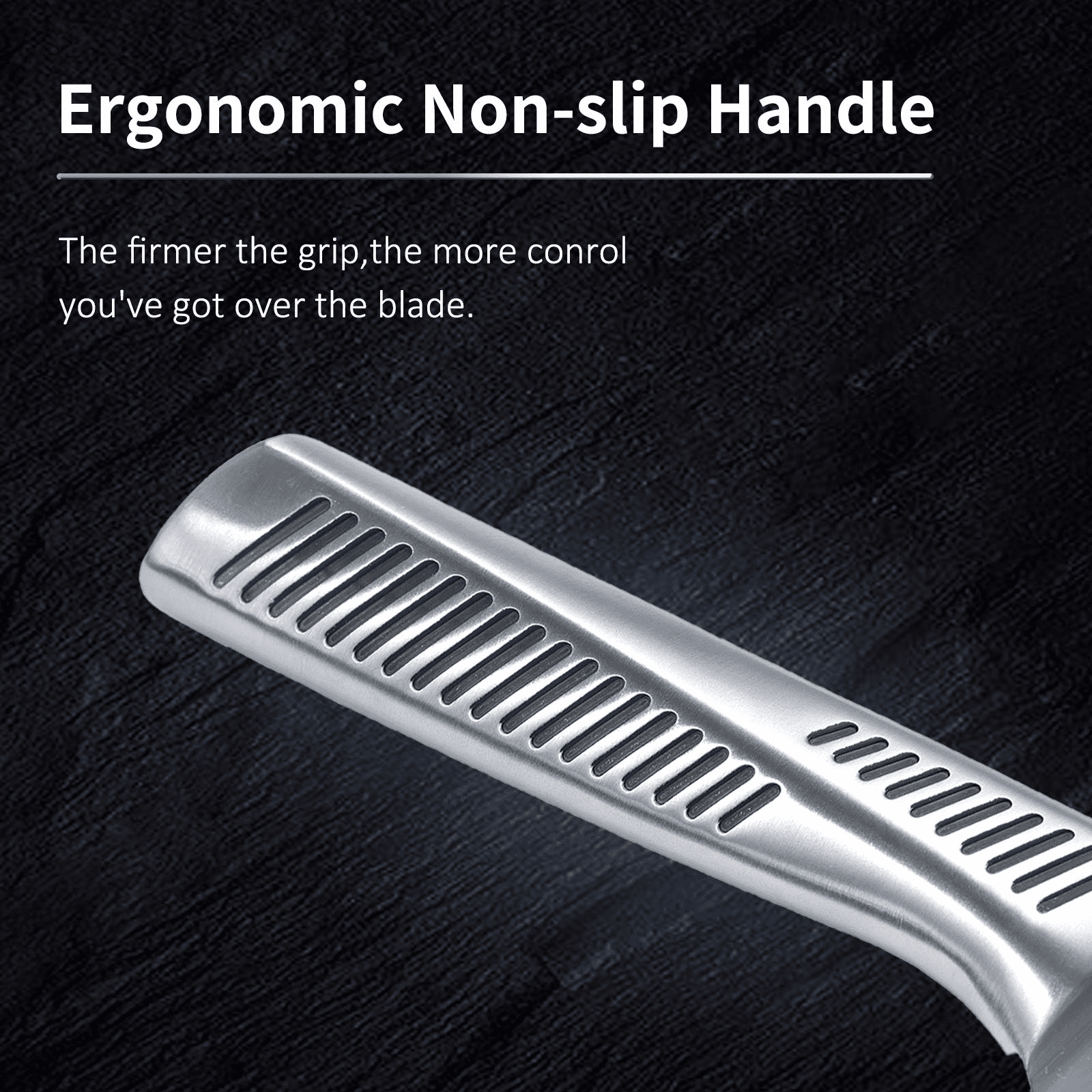• [ERGONOMIC Hollow HANDLE] - Stainless Steel hollow handles gives a lot of character and beauty to kitchen knives. Full tang knife blade provides maximum comfort and stability while cutting; which can enjoy cooking more faster; easier and cleaner.